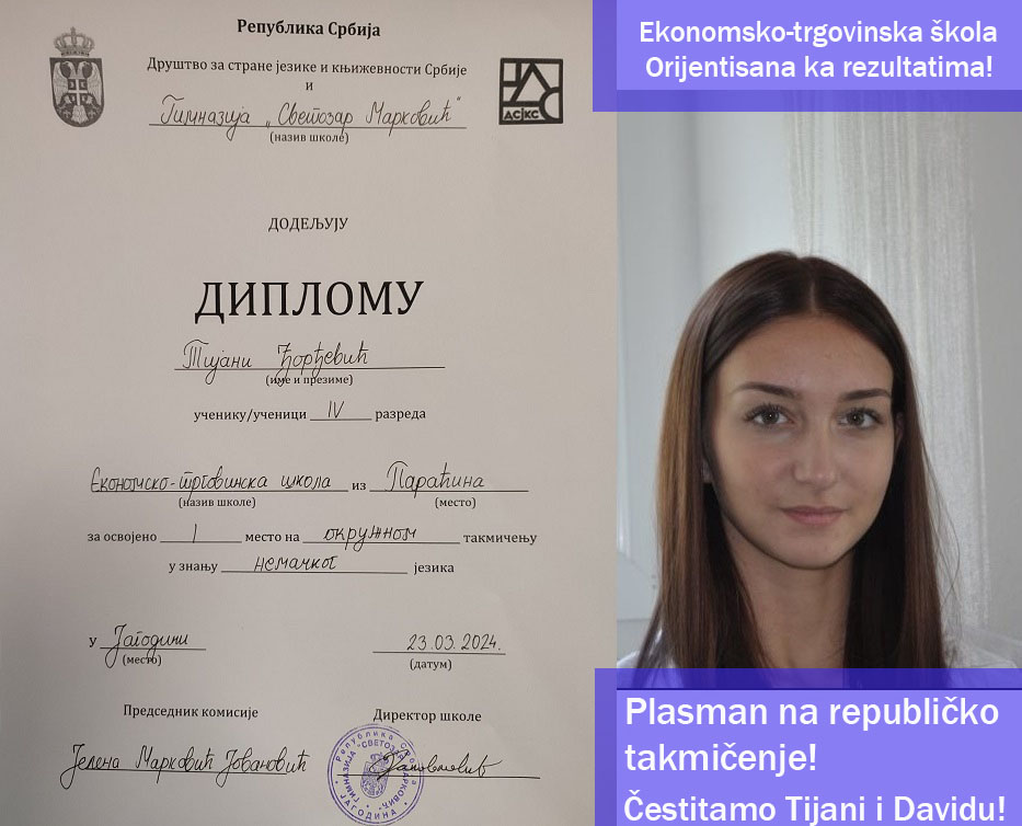 На Окружном такмичењу из страних језика, одржаном 23.3.2024. у Јагодини, наши ученици, Тијана Ђорђевић (4/3) и Давид Ђорђевић (2/3), били су веома успешни из немачког језика: Тијана је освојила 1.место, а Давид 3.место, обоје у специјалној категорији и обоје иду на Републичко такмичење у априлу.